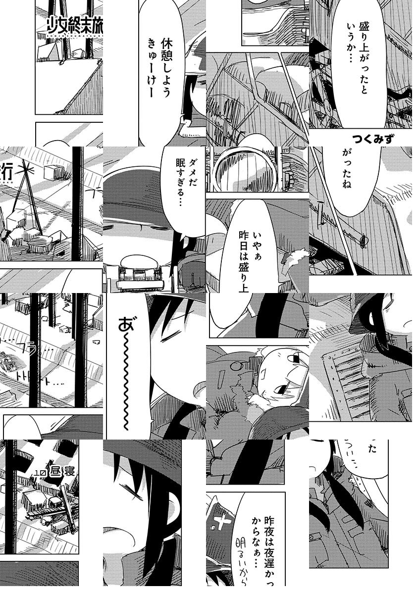 終末世界でふたりぼっちになってしまったチトとユーリは、愛車のケッテンクラートに乗って延々と広がる廃墟をあてもなくさまよう。日々の食事さえも事欠く、明日の見えない毎日。だけどそんな「日常」も、ふたり一緒だと、どこか楽しげだったりもして……。