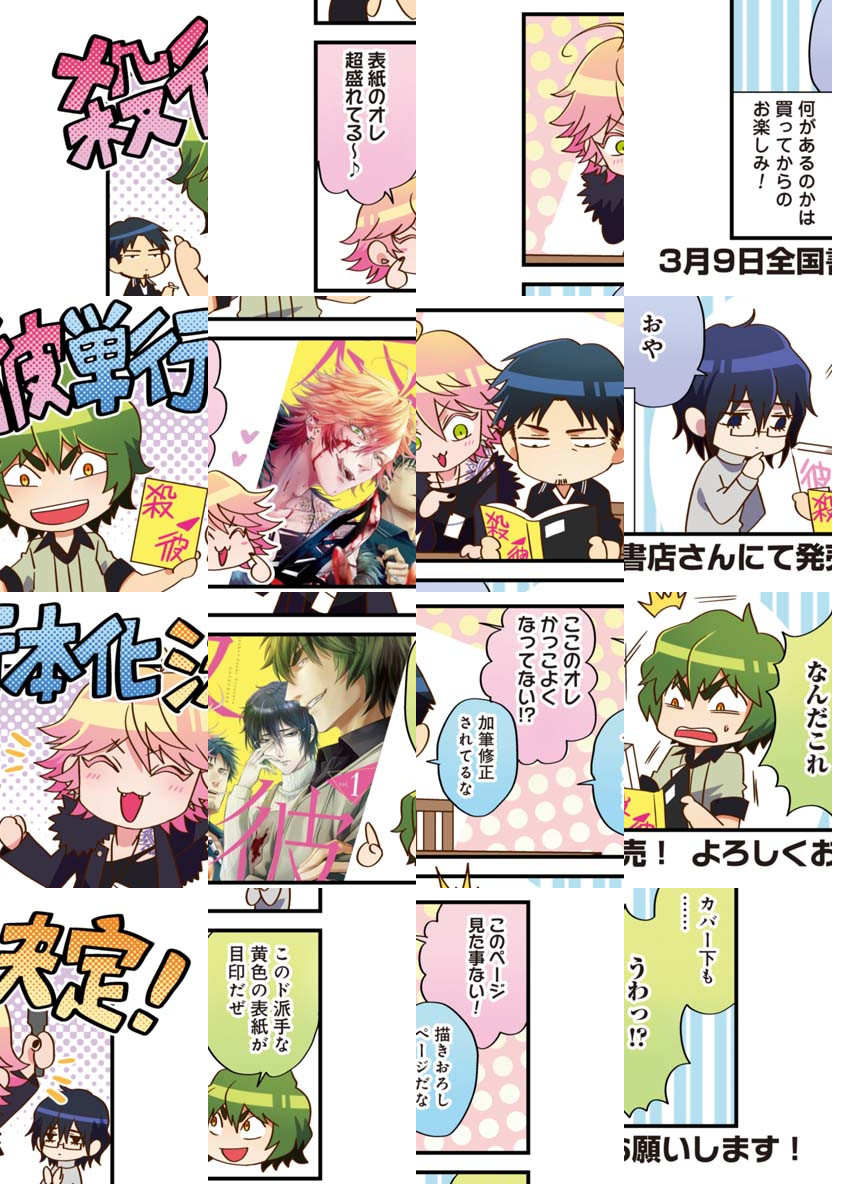 元々同人誌で好き放題に描いていた漫画だったのでまさかこうして大きな場で展開させてもらえるとは思っていませんでした。ある程度読み手を選ぶ内容ですが今までより更に多くの人に楽しんで頂けるように頑張ります。オタク二人が捻り出した殺人鬼達をどうぞよろしくお願いします。(大介)