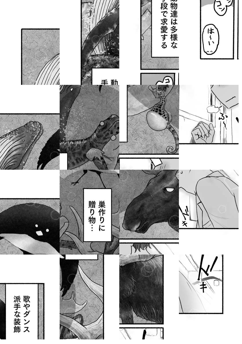 鳥類の多くは、一夫一妻です。なかでもクロコンドルは、群れの仲間の浮気を厳しく監視して、違反者は容赦ない制裁を受けます。すでに相手のいる者に、さらに別の異性へ手を出されては自分のチャンスが減ってしまいますので独身の者はたまったものではありません。人間社会における不倫への風当たりの強さも、同様の心理が働いているのかもしれません。何事においても倫理観や固定観念を一度捨てて、その根本に潜むであろう動物的な行動心理について考察してみるのもたまには面白いかと。