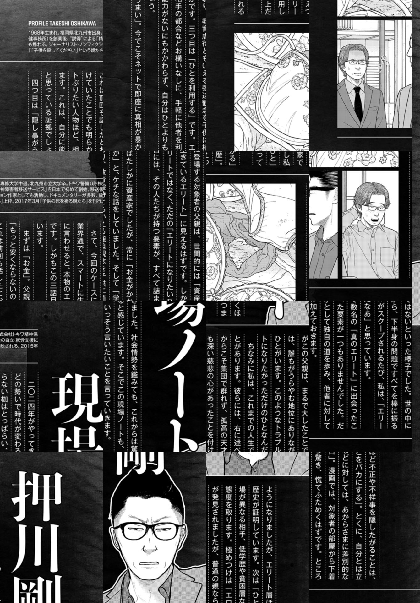 過度の教育圧力に潰れたエリートの息子、酒に溺れて親に刃物を向ける男、母親を奴隷扱いし、ゴミに埋もれて生活する娘…。現代の裏側に潜む家族と社会の闇を抉り、その先に光を当てる…。様々なメディアで取り上げられた押川剛の衝撃のノンフィクションを鬼才・鈴木マサカズの力で完全漫画化!
