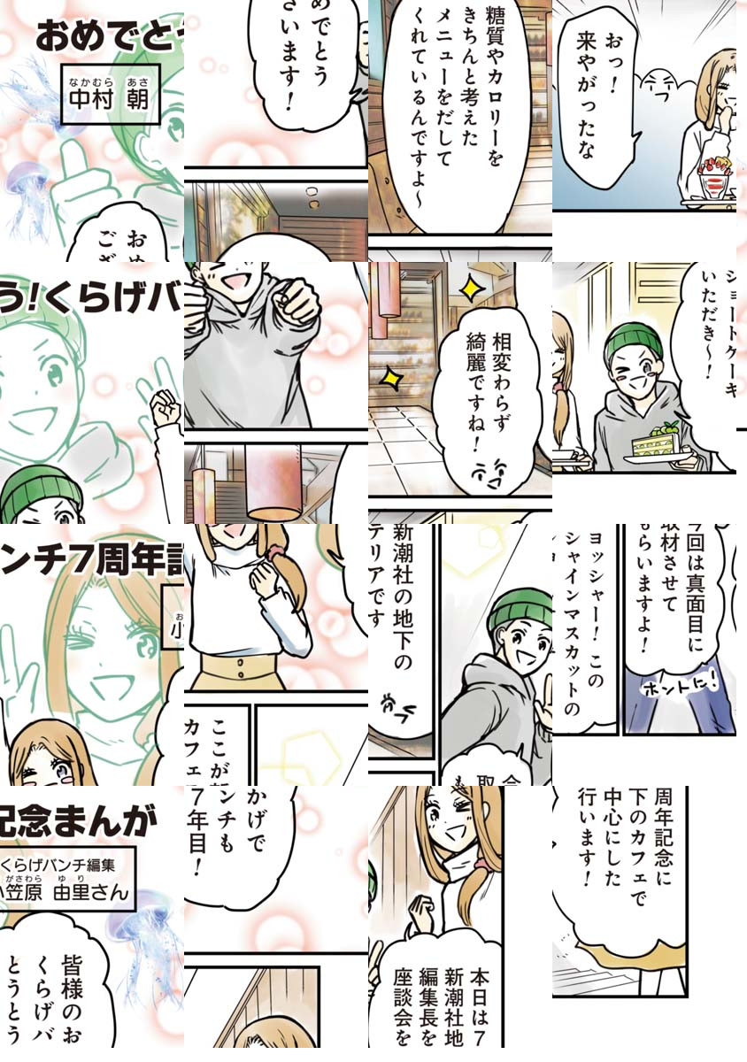 くらげバンチ生誕7周年を記念し、新潮社のカフェテラスにて編集長や連載作家陣による座談会が開催!中村朝先生がその座談会のレポートまんがを描いてくれました。今、明かされる7年の軌跡――!