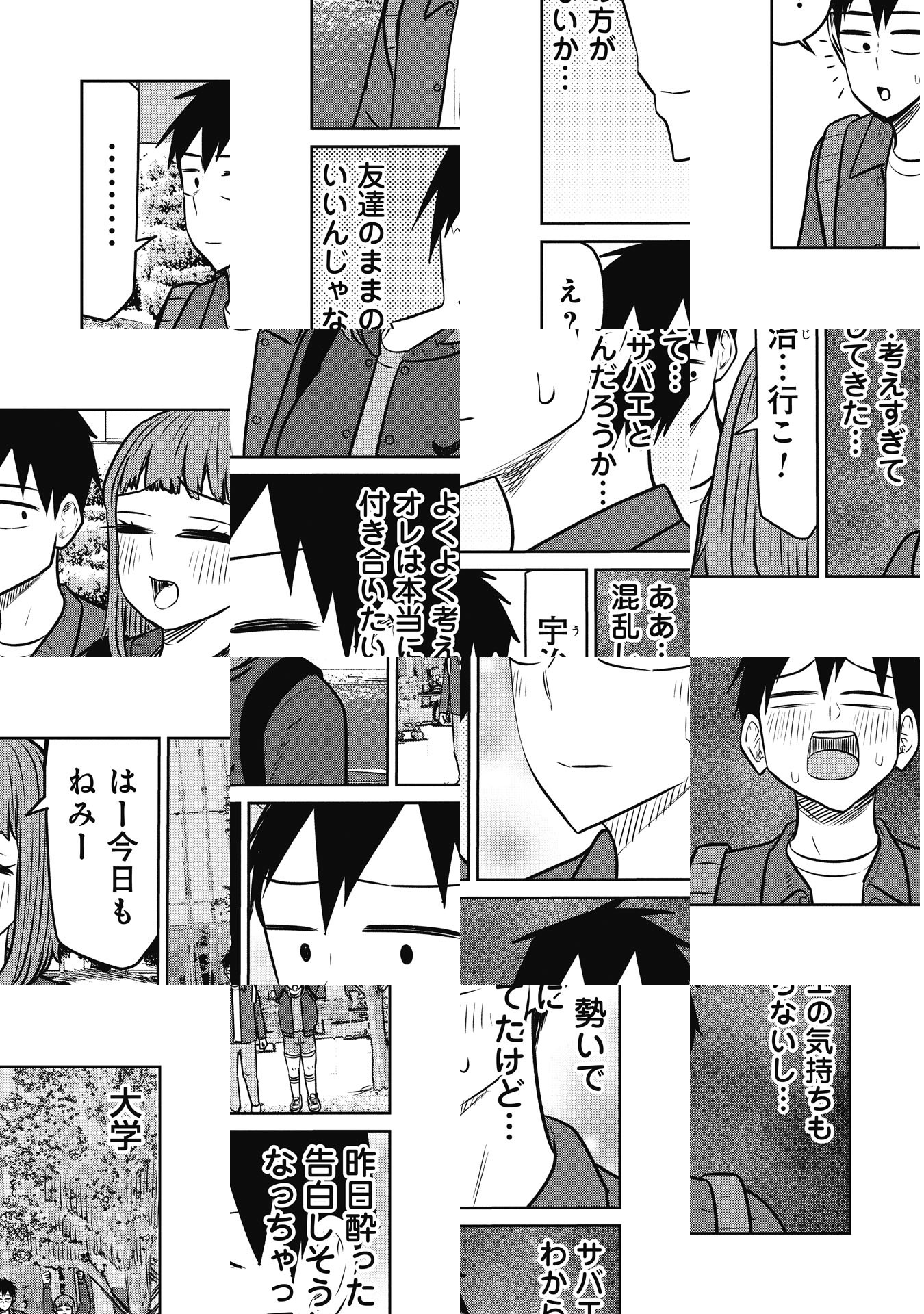 大学生の宇治は、同級生の桜井さんへの片思いの相談する為、桜井さんと親友で、自分の友人でもある鯖江に相談するが、二人っきりの居酒屋で変な雰囲気になってしまい…友情を取るか性欲を取るか!理性ギリギリキャンパスライフ開幕!!