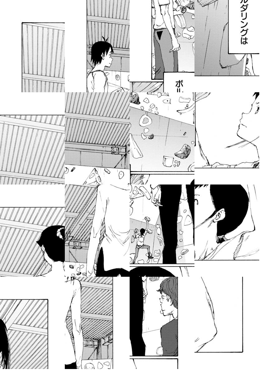 「ボルダリング漫画です。これを機に、ボルダリング面白そうやってみようと思われた方、くれぐれも無理はしないようにお願いします。いずれそういうネタにも触れるつもりですが非常に負荷が高いスポーツです。自転車では無理をして「超え」てもその日一日 走れない程度で済みますが、ボルダリングで自分の限界を「超え」ると数日、数週間、数カ月、もしかすると数年、ボルダリングが出来なくなる可能性があります。趣味スポーツは自制心ですね。ん?自分? 経験者は語る、ですね。では「のボルダ」本編よろしくお願いします。/『完全版 ぼくらの』全5巻好評発売中。「コミックDAYS」にて『ヨリシロトランク』を原作連載中。