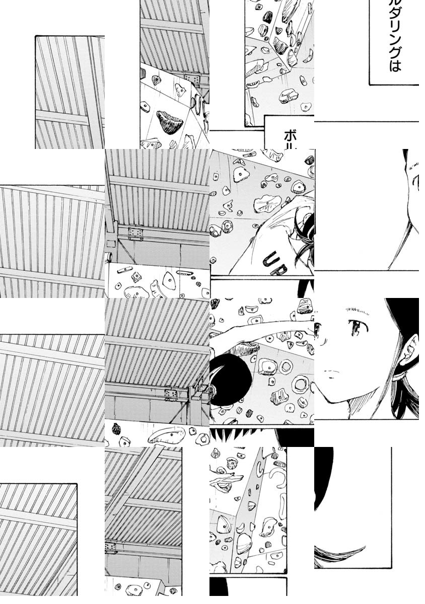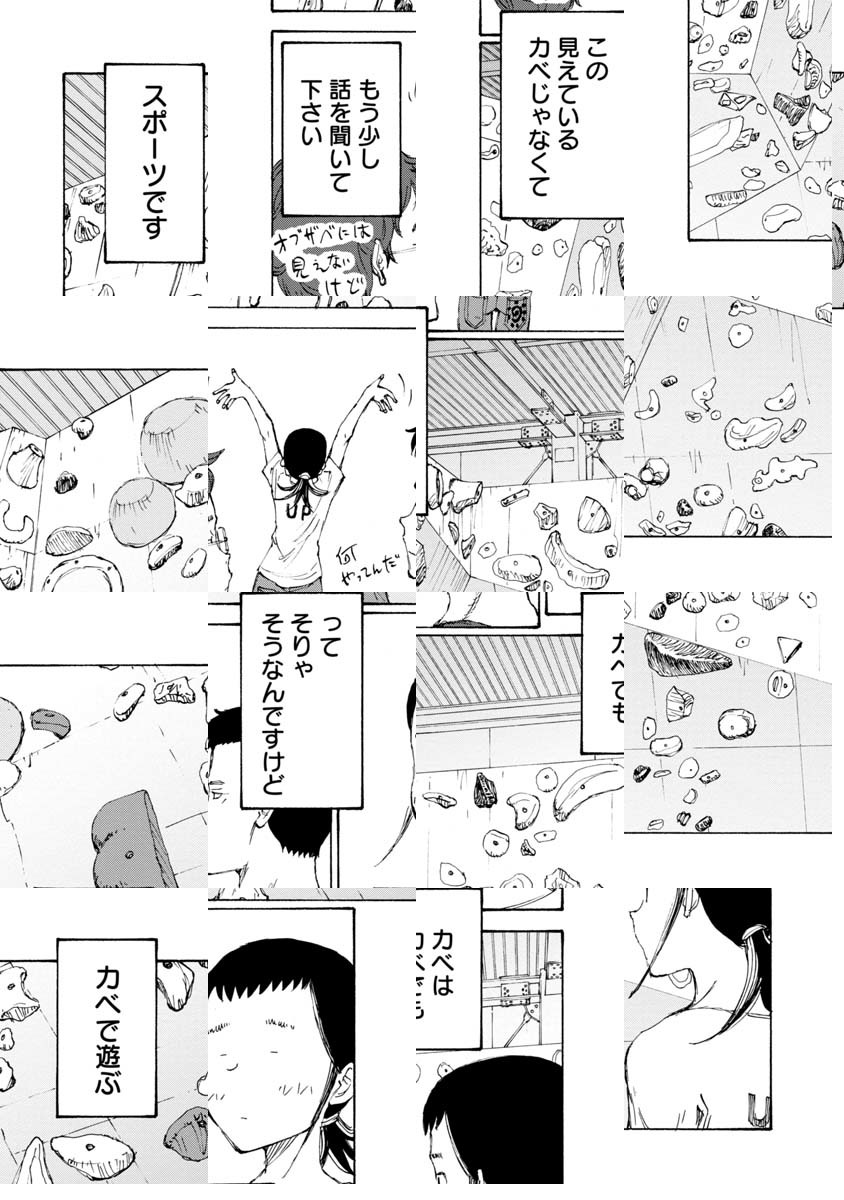 「ボルダリング漫画です。これを機に、ボルダリング面白そうやってみようと思われた方、くれぐれも無理はしないようにお願いします。いずれそういうネタにも触れるつもりですが非常に負荷が高いスポーツです。自転車では無理をして「超え」てもその日一日 走れない程度で済みますが、ボルダリングで自分の限界を「超え」ると数日、数週間、数カ月、もしかすると数年、ボルダリングが出来なくなる可能性があります。趣味スポーツは自制心ですね。ん?自分? 経験者は語る、ですね。では「のボルダ」本編よろしくお願いします。/『完全版 ぼくらの』全5巻好評発売中。「コミックDAYS」にて『ヨリシロトランク』を原作連載中。