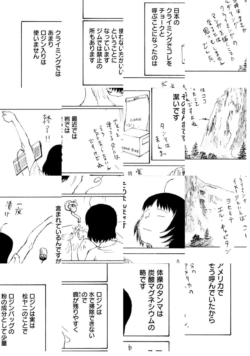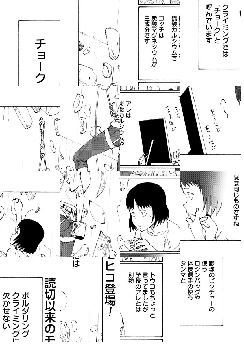 「ボルダリング漫画です。これを機に、ボルダリング面白そうやってみようと思われた方、くれぐれも無理はしないようにお願いします。いずれそういうネタにも触れるつもりですが非常に負荷が高いスポーツです。自転車では無理をして「超え」てもその日一日 走れない程度で済みますが、ボルダリングで自分の限界を「超え」ると数日、数週間、数カ月、もしかすると数年、ボルダリングが出来なくなる可能性があります。趣味スポーツは自制心ですね。ん?自分? 経験者は語る、ですね。では「のボルダ」本編よろしくお願いします。/『完全版 ぼくらの』全5巻好評発売中。「コミックDAYS」にて『ヨリシロトランク』を原作連載中。