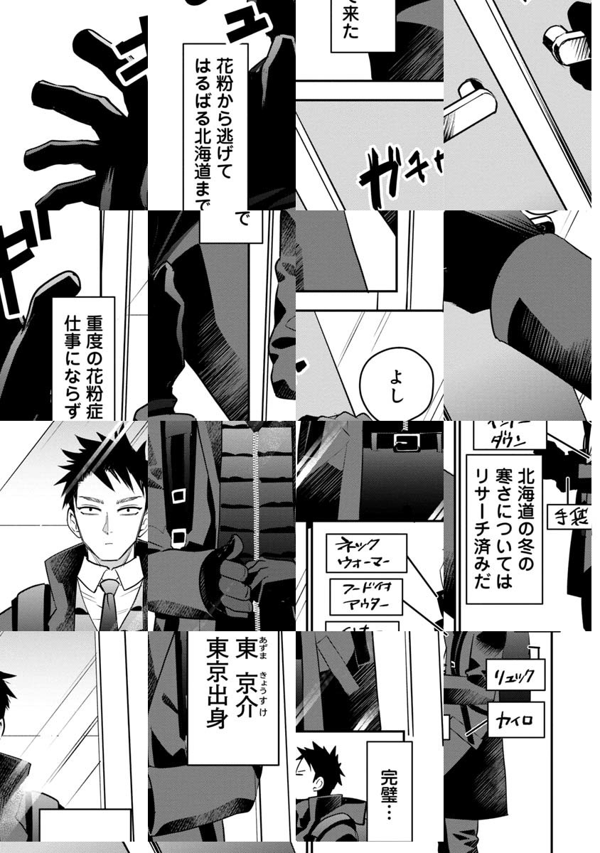 東京出身の東 京介(あずま きょうすけ)は、花粉症から逃げて北海道に引っ越してきた。初出社の朝、待ち受けていたのは、テッカテカに凍った氷道だった……。一歩も動くことができない彼に手を差し伸べたのは――!?