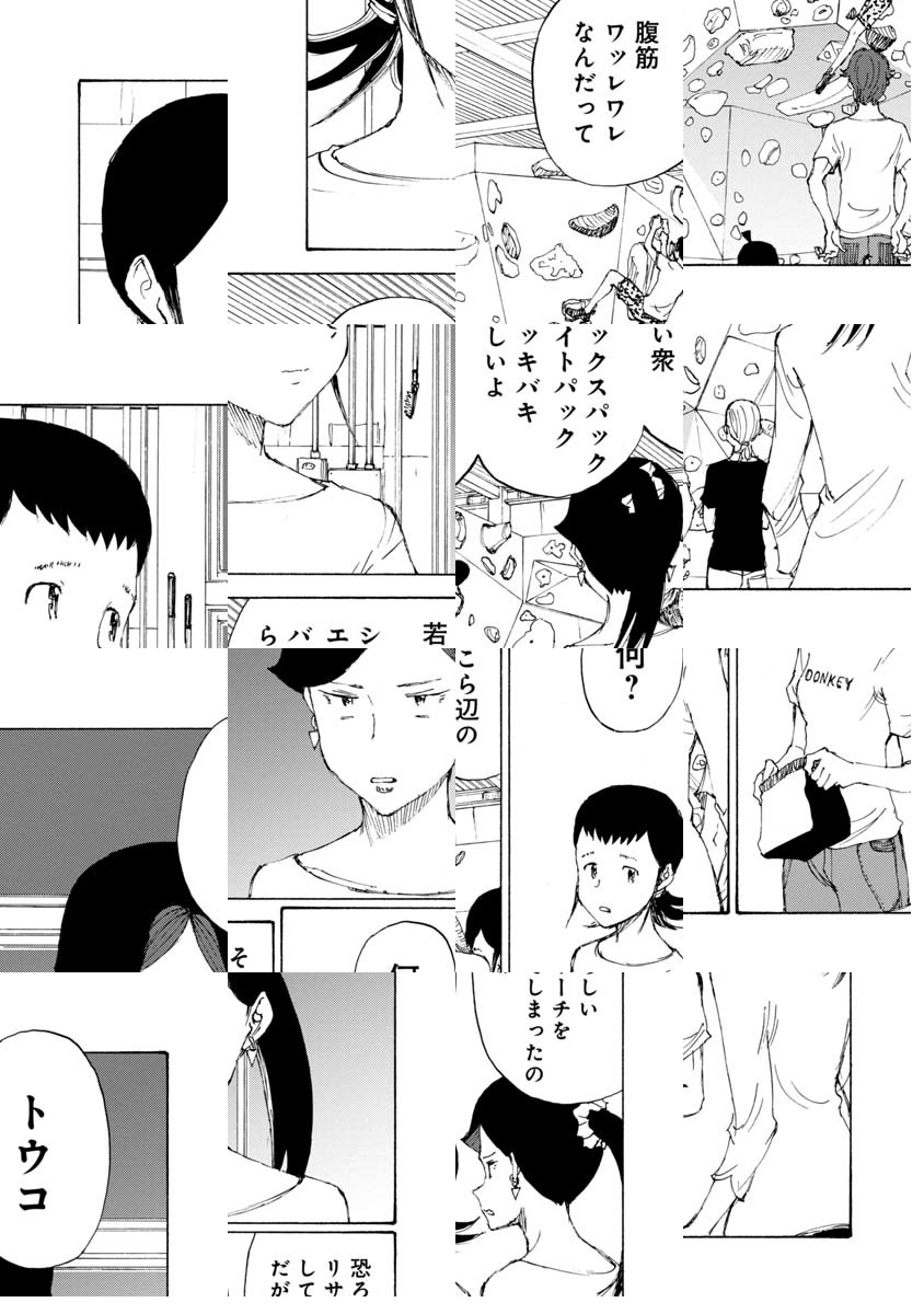 「ボルダリング漫画です。これを機に、ボルダリング面白そうやってみようと思われた方、くれぐれも無理はしないようにお願いします。いずれそういうネタにも触れるつもりですが非常に負荷が高いスポーツです。自転車では無理をして「超え」てもその日一日 走れない程度で済みますが、ボルダリングで自分の限界を「超え」ると数日、数週間、数カ月、もしかすると数年、ボルダリングが出来なくなる可能性があります。趣味スポーツは自制心ですね。ん?自分? 経験者は語る、ですね。では「のボルダ」本編よろしくお願いします。/『完全版 ぼくらの』全5巻好評発売中。「コミックDAYS」にて『ヨリシロトランク』を原作連載中。