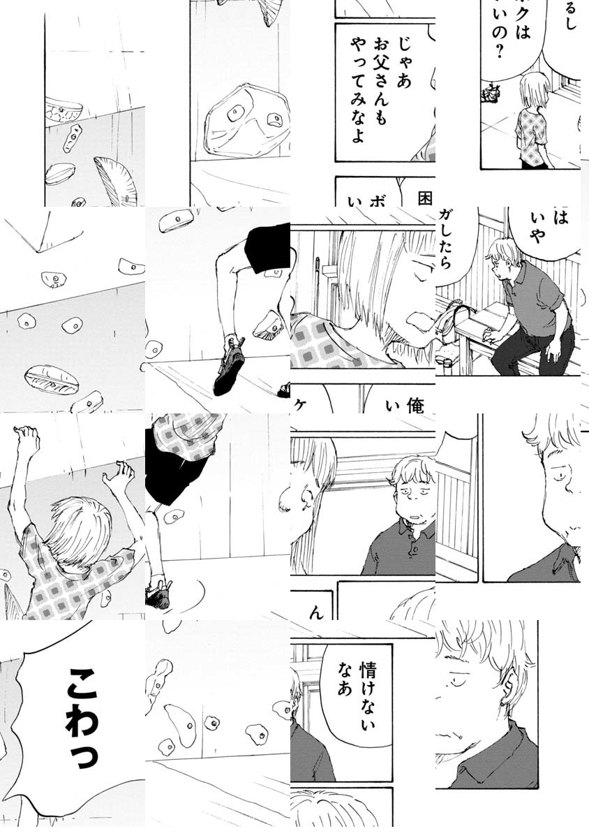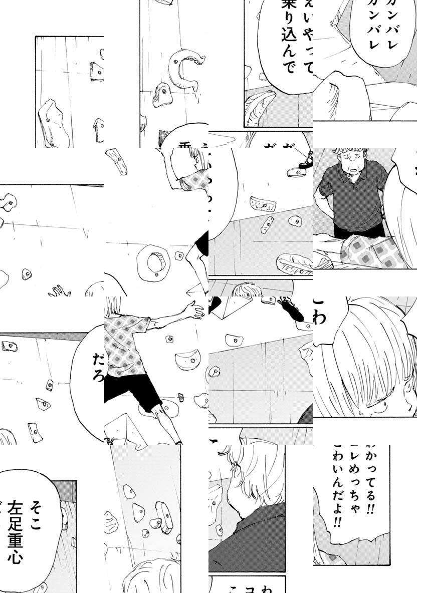 「ボルダリング漫画です。これを機に、ボルダリング面白そうやってみようと思われた方、くれぐれも無理はしないようにお願いします。いずれそういうネタにも触れるつもりですが非常に負荷が高いスポーツです。自転車では無理をして「超え」てもその日一日 走れない程度で済みますが、ボルダリングで自分の限界を「超え」ると数日、数週間、数カ月、もしかすると数年、ボルダリングが出来なくなる可能性があります。趣味スポーツは自制心ですね。ん?自分? 経験者は語る、ですね。では「のボルダ」本編よろしくお願いします。/『完全版 ぼくらの』全5巻好評発売中。「コミックDAYS」にて『ヨリシロトランク』を原作連載中。