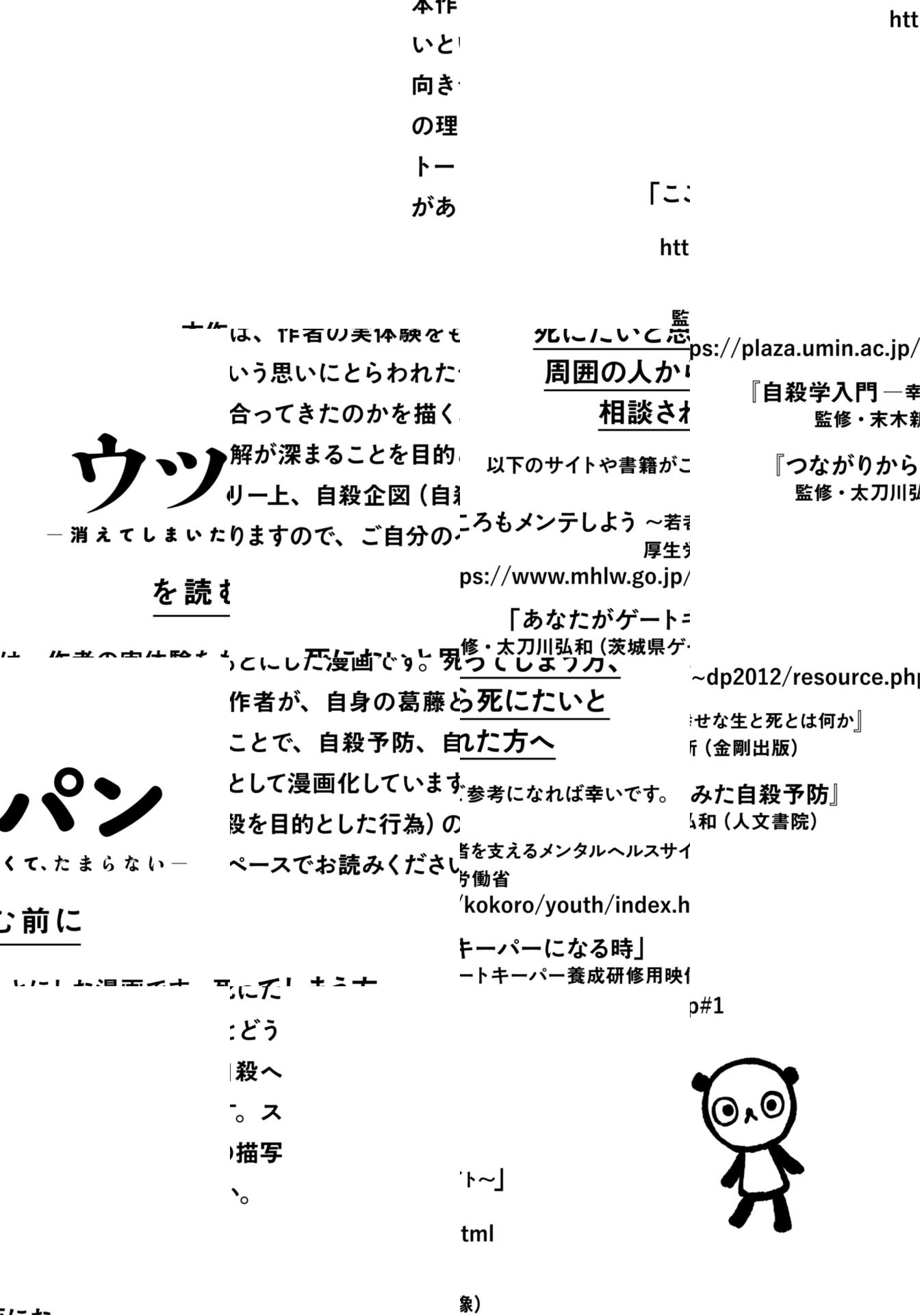 ある日、目が覚めると28時間が経っていた。ふとんから起き上がれなくなったウツパンは、やがて「死にたい」気持ちに振り回されるようになる…。生きていく苦しさから逃れたくて、「死」を選んだウツパンが見つけた生きる道とは――⁉ 死への葛藤をリアルに描いたコミックエッセイ。単行本全1巻好評発売中‼︎