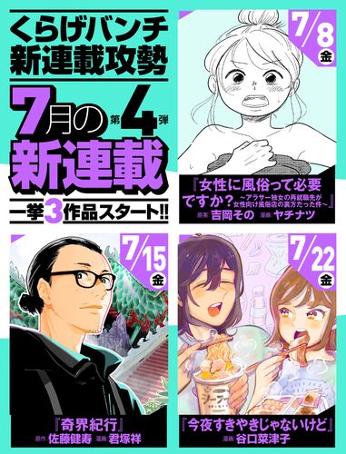 6月も終わりに近づいてきて、 いよいよ夏到来!! くらげバンチは夏の暑さに負けない 刺激的な新連載をご用意しました!! ●7月8日(金)スタート 『女性に風俗って必要ですか?〜アラサー独女の再就職先が女性向け風俗店の裏方だった件〜』原案:吉岡その …