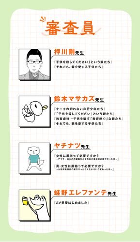 ■審査員&代表作試し読みはこちら 押川剛先生 『「子供を殺してください」という親たち』『それでも、親を愛する子供たち』など 鈴木マサカズ先生 『ケーキの切れない非行少年たち』『教育虐待 ―子供を壊す「教育熱心」な親たち』など ヤチナツ先生 『女性に…